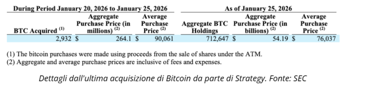 L’acquisto ha portato le riserve Bitcoin complessive di Strategy a 712.647 BTC, acquistati per circa 54,19 miliardi di dollari a un prezzo medio di 76.037 $ per moneta.
