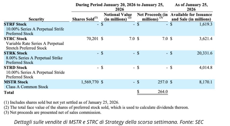 Secondo il documento depositato presso la Securities and Exchange Commission (SEC), la società ha venduto la scorsa settimana circa 1,7 milioni di azioni MSTR, generando 257 milioni di dollari. Inoltre, Strategy ha ceduto 70.201 azioni di Series A Perpetual Stretch Preferred Stock (STRC), incassando altri 7 milioni di dollari.